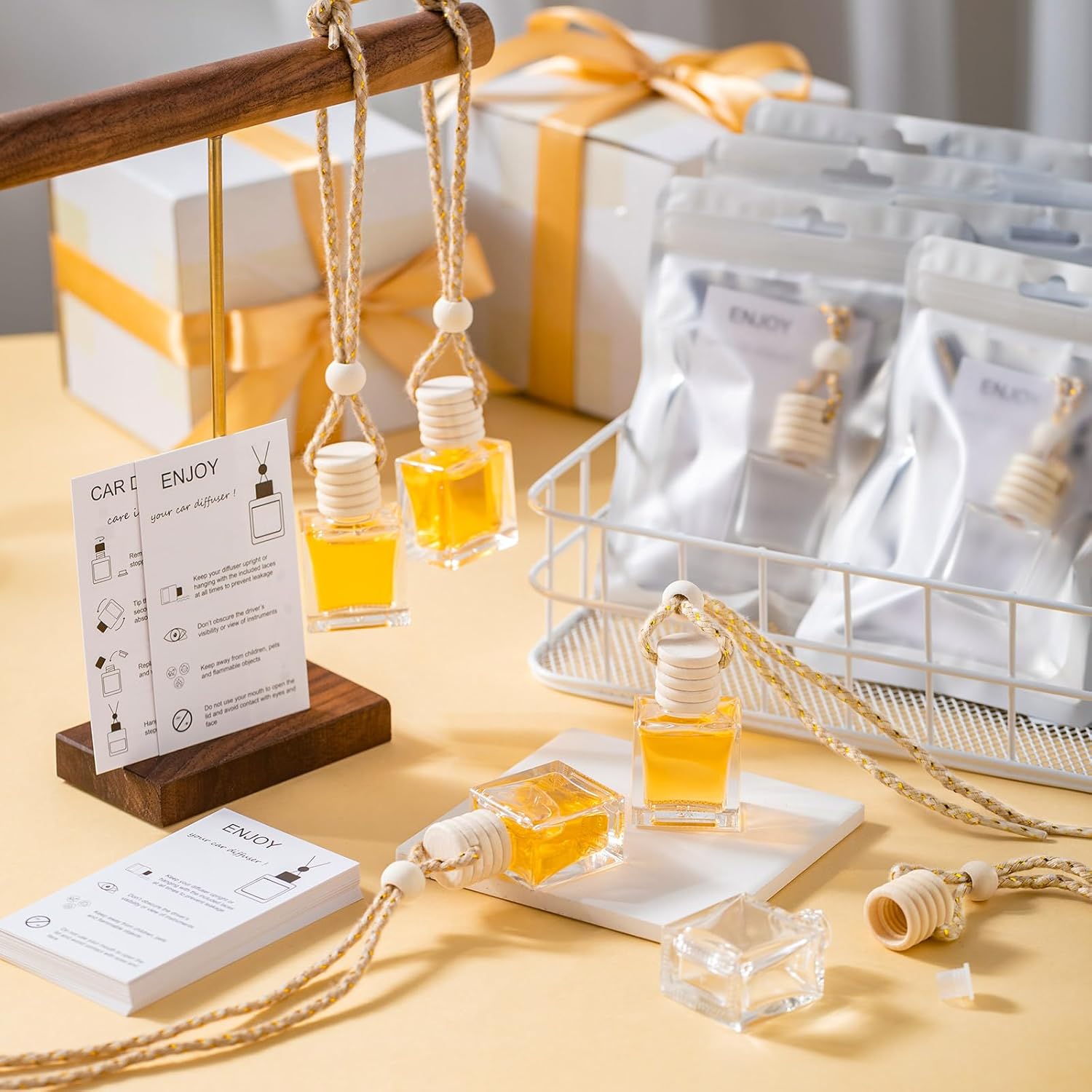 To begin, carefully remove the wooden cap from the bottle and extract the clear plastic stopper. Reattach the wooden cap to the bottle by tightening it securely. With caution, tilt the bottle upside down until the fragrance begins to saturate the top of the cap. Once this is achieved, return the bottle to an upright position and remove the wooden cap again. Immediately place the clear plastic stopper back into the opening to prevent any leakage. Ensure that the wooden cap is tightly secured once more onto the bottle. Finally, use the accompanying strings, tie and secure the diffuser to your rearview mirror in your car, or add it to closets, bathrooms, lockers, or any small space that could use a burst of fresh fragrance. Please ensure that any fragrance oil that may have come into contact with your skin is thoroughly washed off.